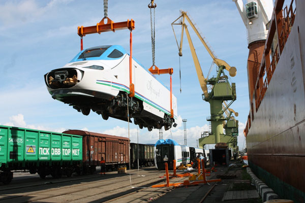 После завершения перегрузочной операции специалисты завода производителя Patents Talgo S.A. (Мадрид) приступили к сборке вагонов в единый состав на причалах ро-ро терминала ГК МПСПб, откуда скоростной поезд длиной 157 метров с помощью российского локомотива отправится в депо станции Металлострой для проверки и наладки оборудования подвижного состава и последующей транспортировки в Узбекистан.