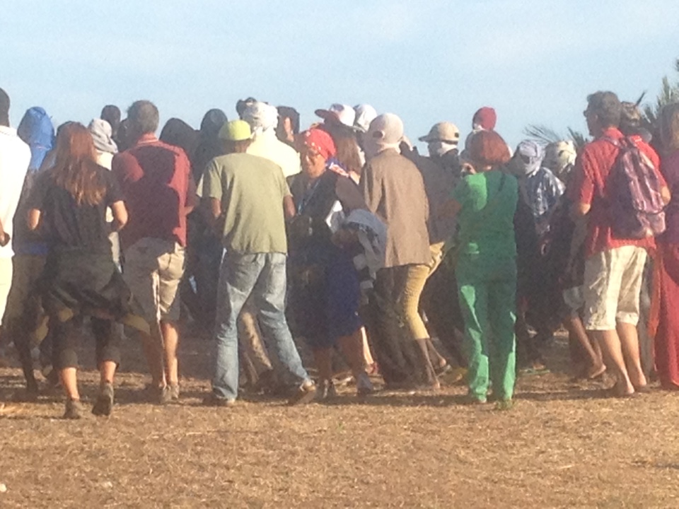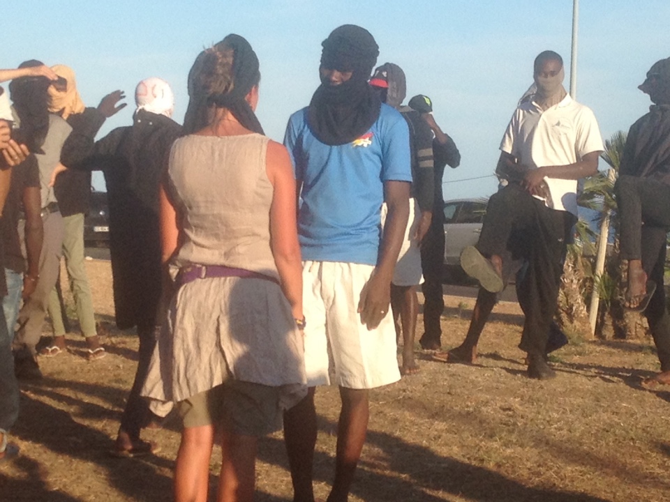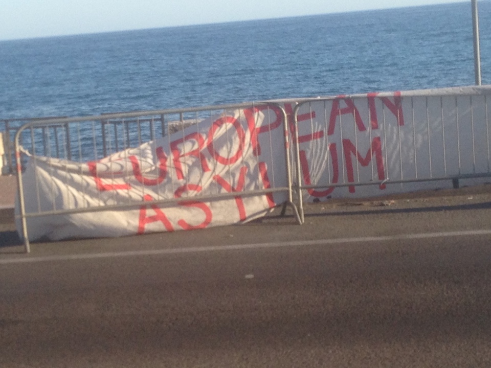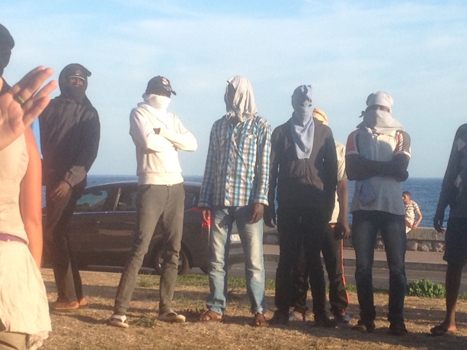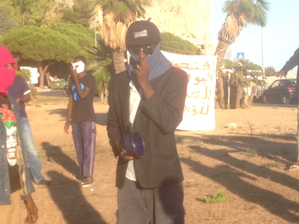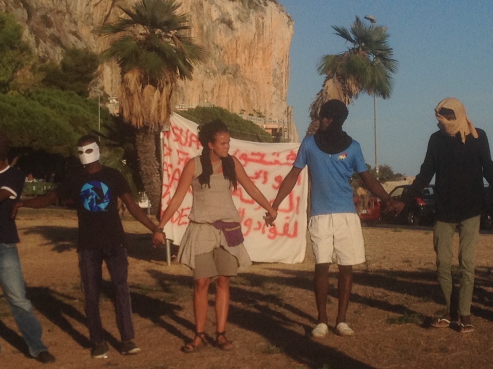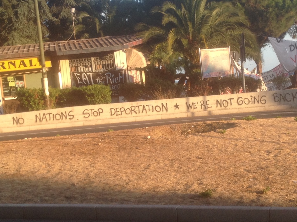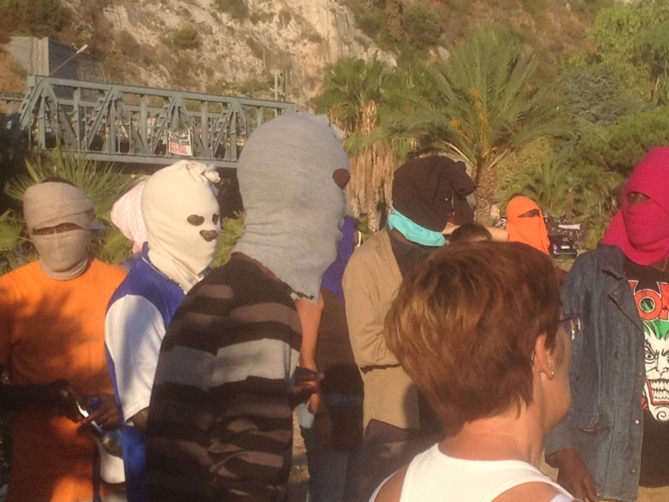 Беженцы сидят на границе, на итальяснкой стороне, их не пускают во Францию жандармы. В настоящее время мигрантам помогают итальянские добровольцы: учат скандировать про воду, делают с ними зарядку.