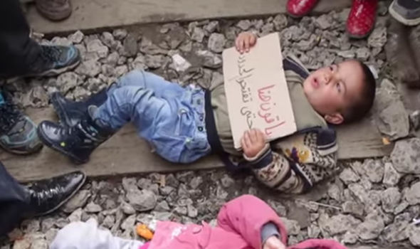В руках у малышей можно заметить плакаты с надписями "откройте границы" и с обвинениями Европы и в расизме.