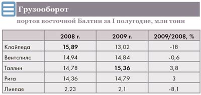 По данным министерства сообщения Латвии, за январь – июнь 2009-го грузооборот портов Балтии составил 60,11 млн тонн, что на 3,3% меньше, чем годом ранее, когда в гаванях Клайпеды, Таллина, Вентспилса, Риги и Лиепаи было обработано 62,2 млн тонн грузов.