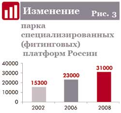 Темпы роста российского рынка контейнерных перевозок были весьма значительны (рис. 2). Однако прирост в основном наблюдался за счет экспортных и импортных перевозок грузов. Увеличения перевозок во внутрироссийском сообщении практически не происходило. Выделение контейнерного бизнеса в отдельную бизнес-единицу позволило нарастить парк специализированных фитинговых платформ и, как уже отмечалось, крупнотоннажных контейнеров. В 2008-м парк фитинговых платформ России составил 31 тыс., что почти в два раза больше, чем в 2002 году (рис. 3).