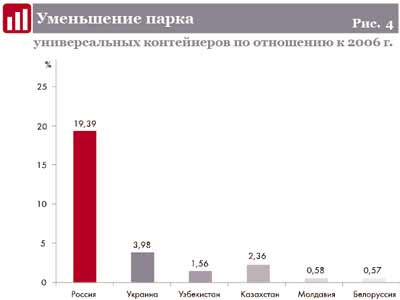 Темпы вывода контейнеров из рабочего парка железнодорожных администраций – основных владельцев контейнеров приведены на рисунке 5. Россия, активно использующая СТК во внутренних перевозках, потеряла почти 20% парка за три года. За один только февраль 2009 года из инвентарного парка был выведен 581 среднетоннажный контейнер, такие темпы предполагают их полное отсутствие в десятилетней перспективе. В этом одна из основных причин замедления роста внутригосударственных российских контейнерных перевозок. Правительством России в 2002 году ставились задачи по многократному увеличению парка как крупнотоннажных, так и среднетоннажных контейнеров. Если по приросту количества КТК задачи почти выполнены, то можно сделать вывод о том, что перевозки грузов в среднетоннажных государством не стимулируются.