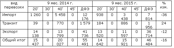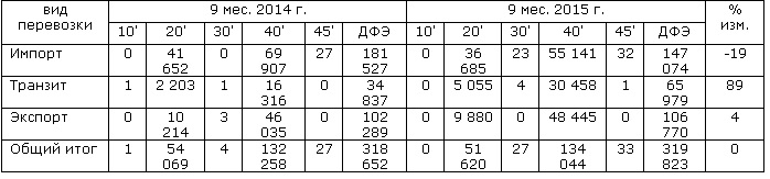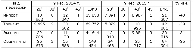 За этот же период объём перевозок груженых и порожних крупнотоннажных контейнеров железнодорожным транспортом с использованием станций Транссибирской магистрали за 9 месяцев текущего года составил 1 251 312 ДФЭ. Это на 7,8% меньше, чем за аналогичный период 2014 г. Из них в составе контейнерных поездов отправлено 521 925 ДФЭ, что на 4,8% меньше аналогичного периода 2014г. Во внутреннем сообщении проследовало 773 830 ДФЭ (-5,5%), из них 248 325 ДФЭ (+1,7%). В международном сообщении 477 482 ДФЭ (-11,4%) из которых в составе контейнерных поездов проследовало 273 600 ДФЭ (-10,0%).