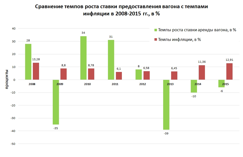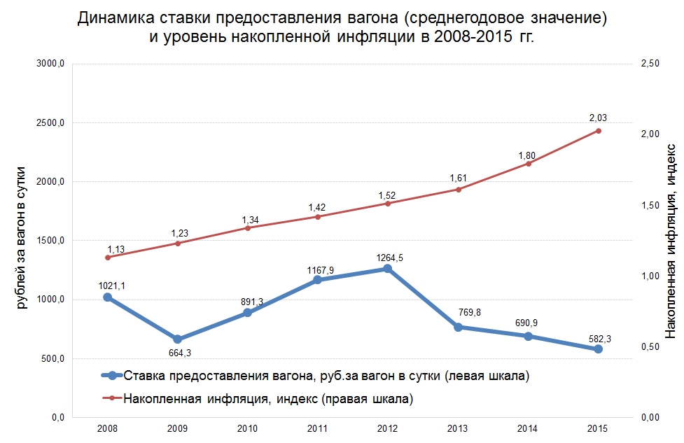 Здесь использованы данные из ежемесячных отчётов СОЖТ, регулярно публиковавшихся на официальном сайте партнерства, а также приведены средние значения ставок для каждого года в период с 2008 г. по 2015-й. Согласно графику, в декабре 2015 года уровень ставок (средневзвешенный по всем родам подвижного состава) составлял 66 % (или минус 34 %) от уровня января 2008 г.