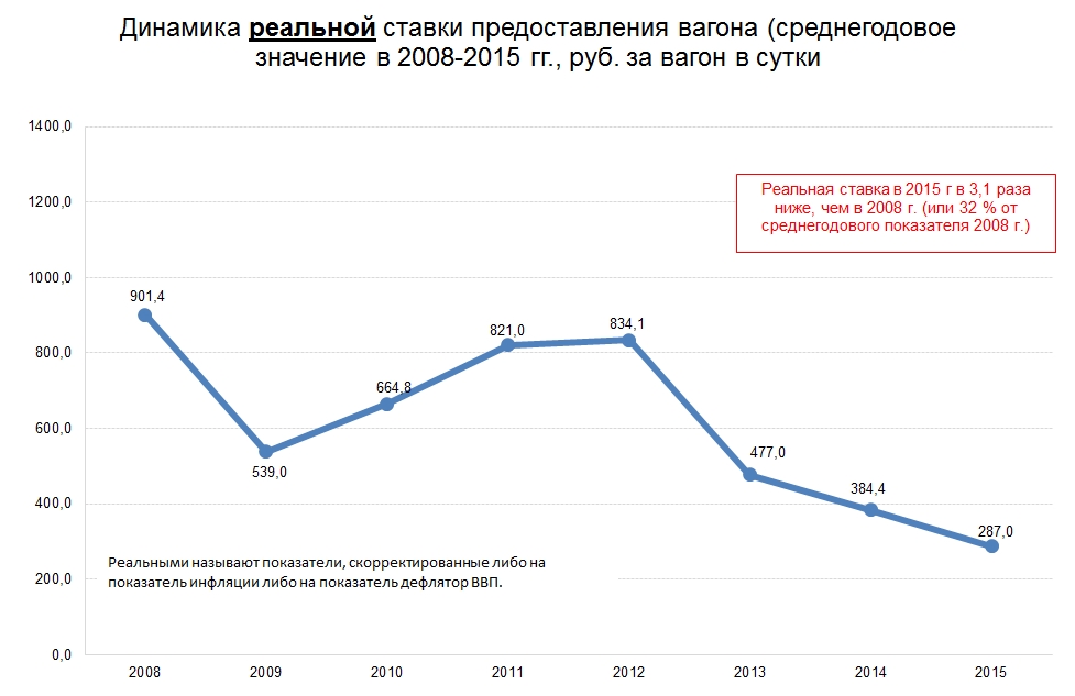 Как видно из графика на рис. 4, при переходе от номинальных цен к реальным ставка предоставления вагона в 2015 году оказывается на уровне, который примерно в три раза ниже, чем в 2008-м, а точнее - составляет всего 32 % от уровня 2008 года.
