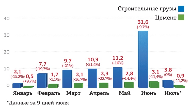 На все эти проблемы весной наложились и другие неприятности: в регионах, столкнувшись с дефицитом бюджетных средств, срочно взялись перекраивать градостроительную политику. Ухудшение спроса на новые объекты охладило инвестиционную активность, а вместе с ней – и потребность застройщиков в нерудных материалах. На бетонных заводах стали меньше заказывать и цемента: если, скажем, за январь и февраль минус в железнодорожной погрузке составлял лишь 3% к аналогичному периоду 2014-го, то по итогам полугодия он достиг уже 14%. Впрочем, стоит отметить, что в июле появилась надежда на перелом негативного тренда: объем перевозки цемента к уровню 2014 года оказался ниже уже только на 11,2%.